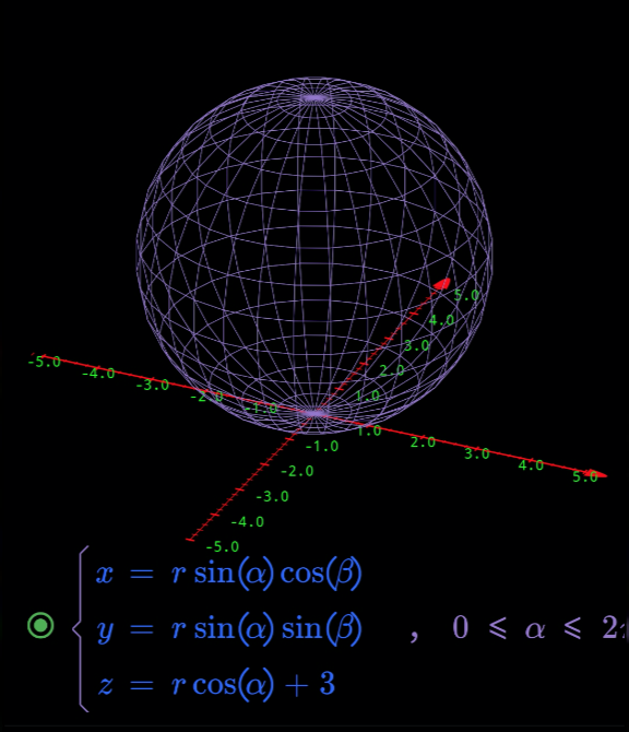 球体依然用参数方程进行绘制。不同于2D圆方程,这里的参变量有两个,且必需为【α和β】。